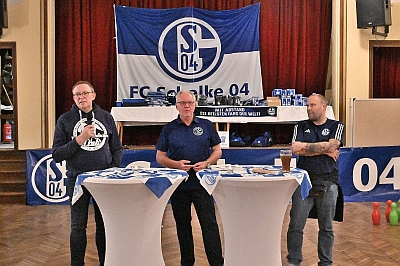 Nach der Diskussionsrunde konnte man sich für die Teilnahme an einem Fussballkegel-Turnier qualifizieren. Max Schober führte - unterstützt von Antonia - alle Teilnehmer durch die Vorrunde, bevor sich in der Runde der letzten drei Jörg Heuting gegen Meggie Krüger und Helmut Menselowski durchsetzen konnte und dafür mit einem Gutschein für ein S04-Trikot belohnt wurde. Die Zuschauerzahlen bei dem Wettbewerb entsprachen schon fast denen in unserer Arena. Auch eine Tombola durfte in diesem Jahr nicht fehlen. Nach dem Motto „jedes Los gewinnt“ fanden mehr als 200 Sachpreise, dabei auch ein Gutschein für ein S04-Trikot als Hauptgewinn, glückliche Gewinner. Einen weiteren Höhepunkt bildete die von Dennis Brucksch organisierte Quizrunde, in der die Teilnehmer bei 04 Schätzfragen ihr Wissen prüfen konnten. Auch hier gab es 04 attraktive Gewinne, u.a. ein Trainingsshirt mit allen Unterschriften der aktuellen Mannschaft. Während der ganzen Zeit standen unsere beiden Gäste weiterhin für persönliche Gespräche zur Verfügung. Einhellige Meinung aller Teilnehmer: zwei sympathische Menschen, die jederzeit wieder bei uns vorbeischauen dürfen.