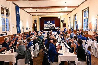 Fast 60 Elztal-Knappen folgten der Einladung des Vorstandes in den großen Saal des Hotels Gasthaus Krone-Post in Simonswald, um dort gemeinsam einen gemütlichen königsblauen Abend zu erleben. Die Veranstaltung startete um 18:04 Uhr mit einem Sektempfang. Dort fanden schon die ersten Fachgespräche über die aktuelle Situation unseres FC Schalke 04 statt. Anschließend begrüßte Dirk Murmann alle anwesenden Mitglieder und stellte die Ehrengäste des Abends vor: Rolf Haselhorst und Thomas Kirschner. Rolf hat in Gelsenkirchen als Bergmann gearbeitet, Bergbau studiert und war anschließend viele Jahre im Management der BASF Ludwigshafen tätig. Nach einem Sportmanagement-Studium in St. Gallen wurde er 2022 in den Schalker Aufsichtsrat gewählt. Somit ist er mit allen aktuellen Entwicklungen bei Schalke 04 vertraut. Thomas, von allen nur „Kirsche“ genannt, ist bei Schalke Leiter der Abteilung Fanbelange und Mitglieder. „Kirsche“ kommt aus der Fanszene und kennt sie mit all ihren Feinheiten und Unterschieden.